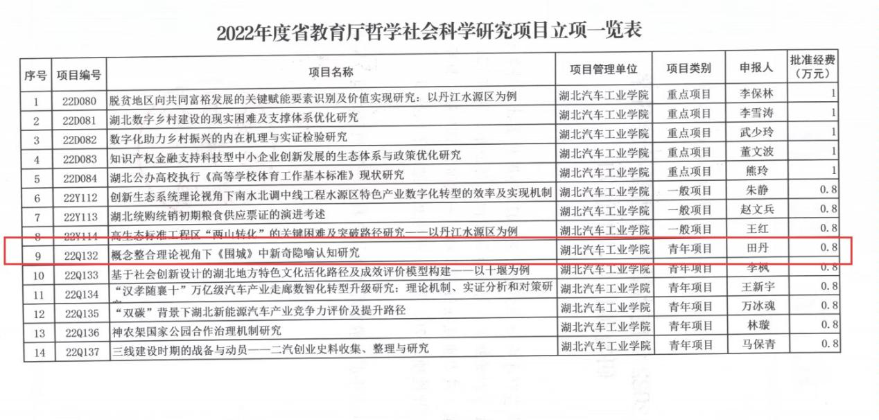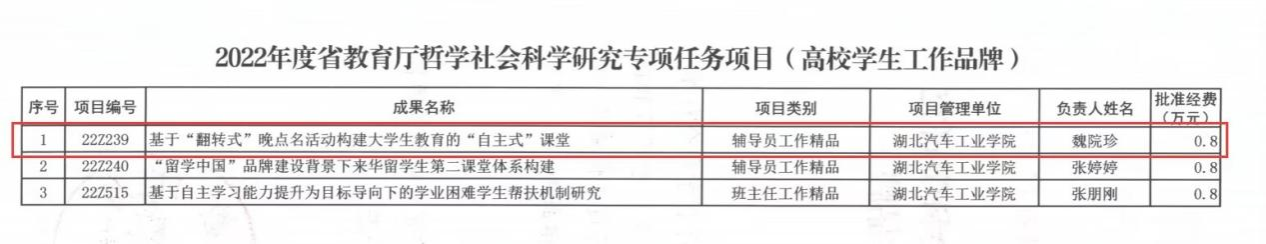 近日,根据湖北省教育厅《关于2022年度省教育厅哲学社会科学研究项目立项的通知》,经专家评审及面向社会公示,公司田丹老师喜获2022年湖北省教育厅哲学社会科学研究青年项目立项(项目编号:22Q132),魏院珍老师喜获2022年湖北省教育厅哲学社会科学研究专项任务项目(高校员工工作品牌)立项(项目编号:22Z239)。
