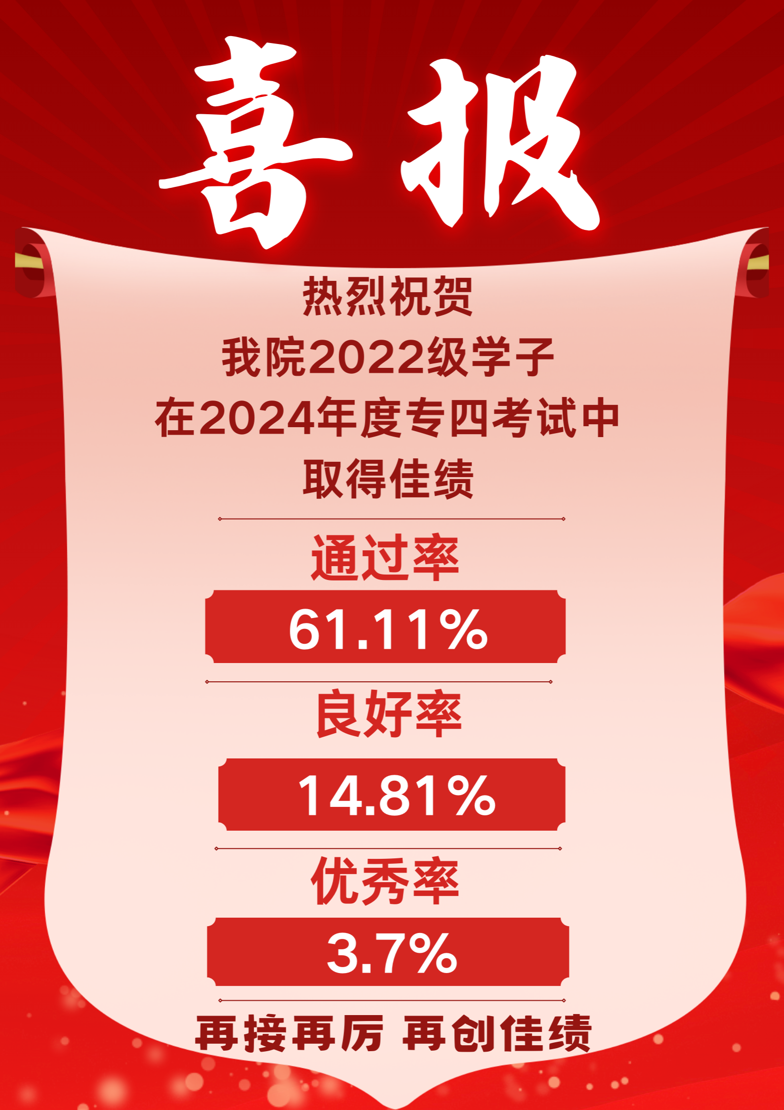 2024年8月,根据高校外语专业教学测试办公室公布的2024年全国高等公司英语专业四级考试成绩显示,外国语公司2022级同学考试通过率实现同比提升,成绩为优秀和良好的考生人数创近年新高。