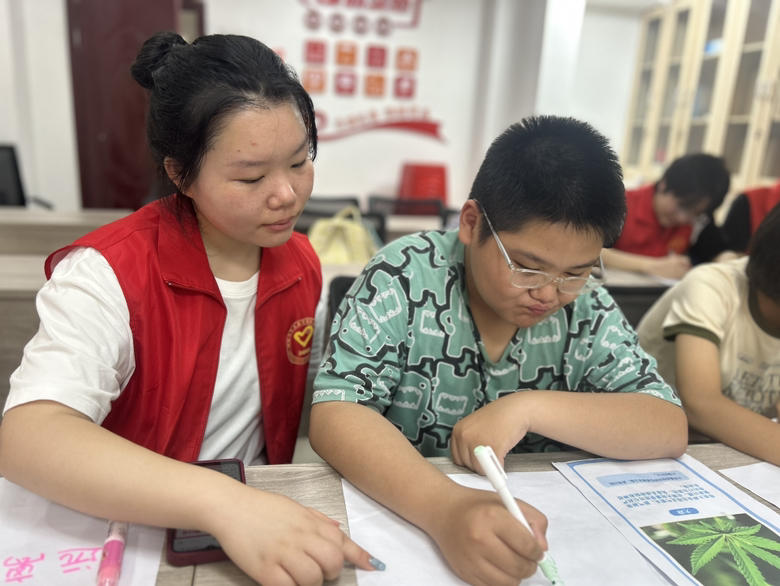 图为实践队成员在指导小朋友绘制禁毒手抄报