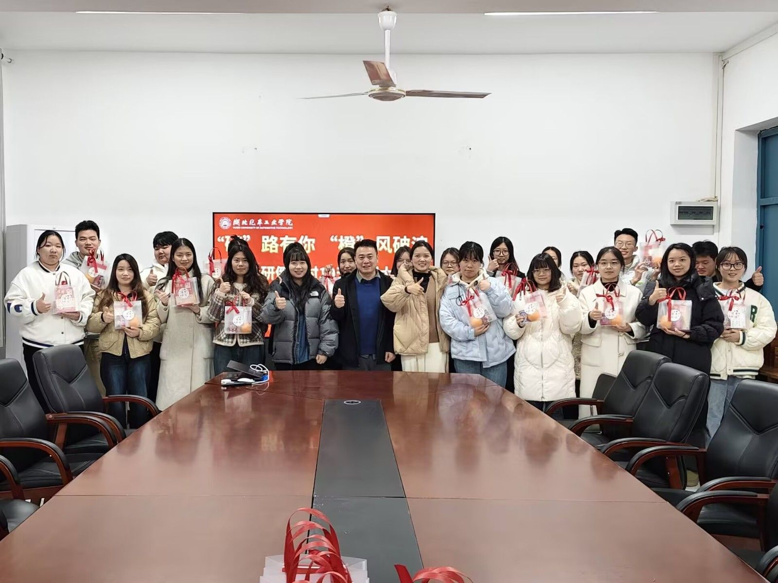 随后,公司领导和老师为考研学子分发精心准备的考研加油大礼包,其中包括寓意心想事“橙”的脐橙、象征好运“旺旺”的旺仔牛奶、“逢考必过”为封面的笔记本以及承载着学弟学妹们美好祝福的卡片,为即将踏上考场的学子们送上了温暖与鼓励。分发礼品后,全体考研学子进行了庄严宣誓,誓言铮铮,展现出他们对考研的坚定信心和必胜决心。大会最后,播放了学弟学妹们专门录制的祝福视频。