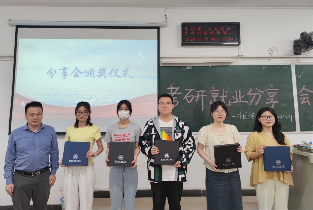 会议伊始,外国语公司分党委副书记魏伟为五位考研就业优秀代表颁奖。颁奖结束,各位优秀代表分享了考研经验与就业心得,详细介绍了自身的备考方法与指南,耐心地向低年级同学答疑解惑。与会员工纷纷表示通过此次分享会,他们受益匪浅,对考研的认识更加全面,进一步坚定了备考的信心。