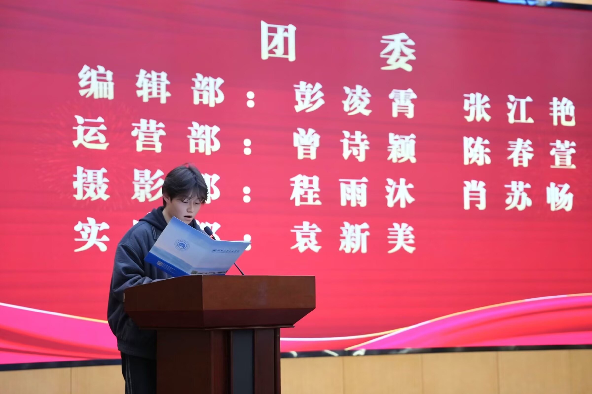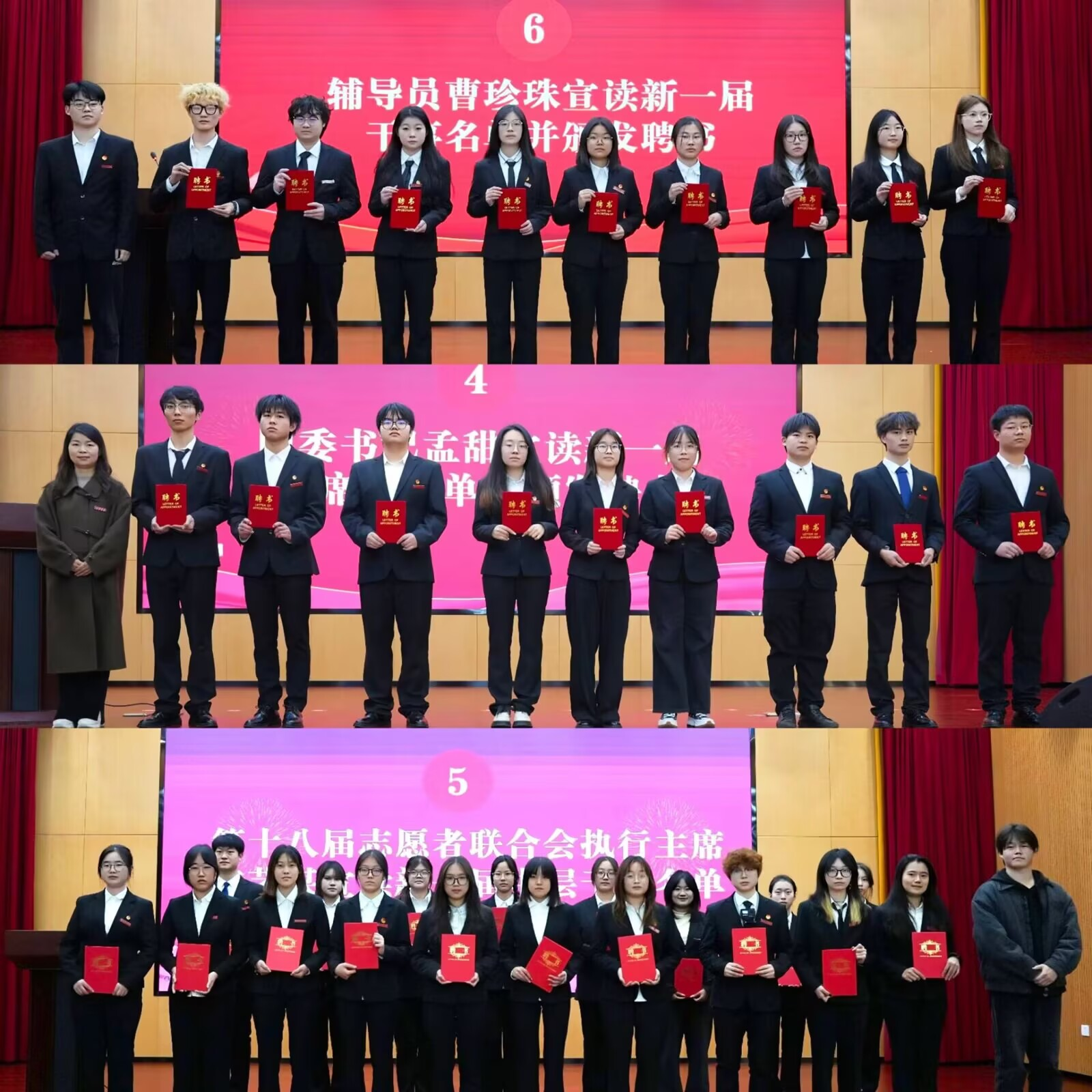 在聘任环节,团委书记孟甜宣读了新一届主席团名单,党委副书记张倩为其颁发聘书;第十八届志愿者联合会执行主席文艺谋宣读新一届中层干部名单并颁发聘书;辅导员曹珍珠宣读新一届干事名单并颁发聘书。