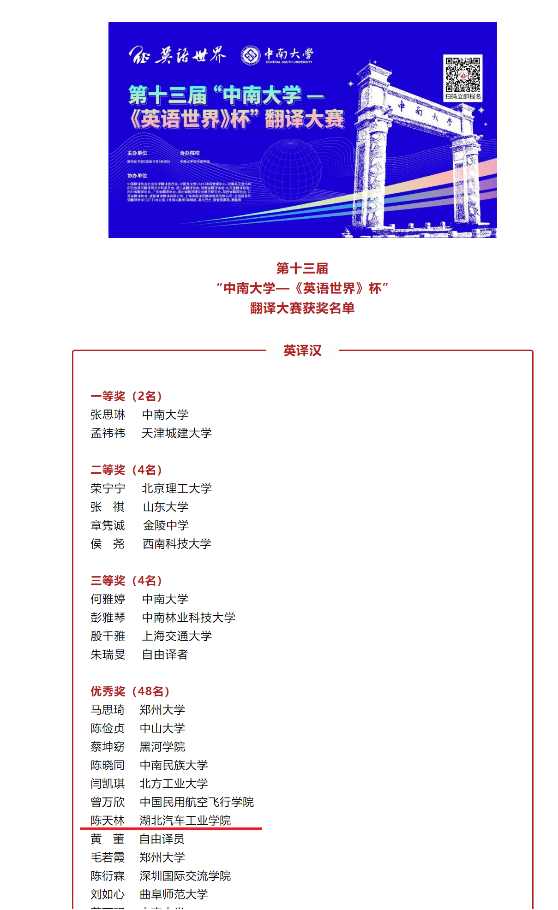2022年9月30日,第十三届“中南大学--《英语世界》杯”翻译大赛公布获奖名单,公司翻译201班同学陈天林喜获“英译汉”组优秀奖的好成绩。这也延续了公司在2021年第十二届“北京师范大学--《英语世界》杯”翻译大赛取得的好成绩。本届翻译大赛共评出英译汉组一等奖2名、二等奖4名、三等奖4名和优秀奖48名。《英语世界》杯翻译大赛肇始于2010年,由商务印书馆《英语世界》杂志社主办,每年举办一次,已经成为国内最有影响的翻译赛事之一。