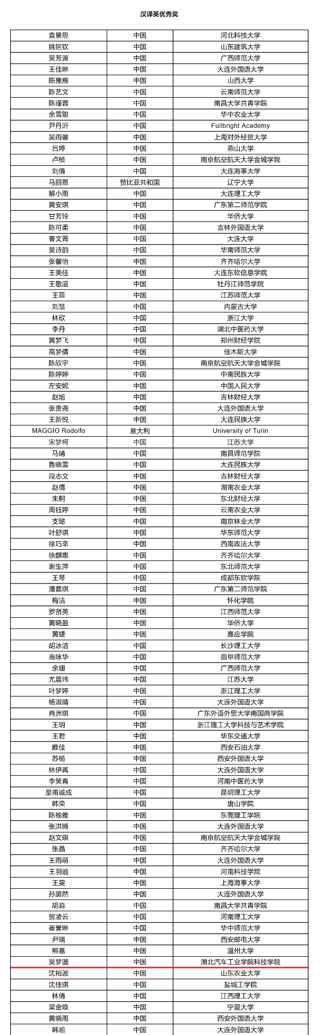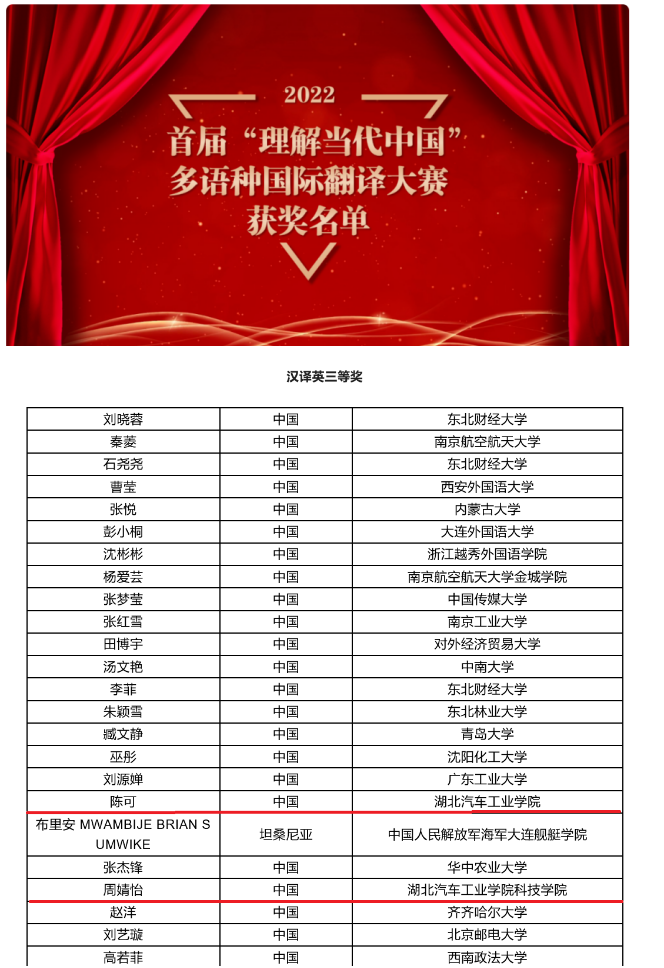 2022年10月30日,首届“理解当代中国”多语种国际翻译大赛公布获奖名单,公司英语202班的同学陈可和科技公司英语203班的同学周婧怡获得了“汉译英”三等奖的好成绩,科技公司英语212班吴梦圆同学获得了“汉译英”优秀奖的好成绩。本届大赛设立英语、法语、俄语、阿拉伯语、西班牙语、日语、德语、朝鲜语、葡萄牙语、意大利语10个语种的汉译外笔译竞赛项目。各语种报名人数共计10147人次,最终提交译文8609份。经过严格的评审流程,包括初审、复审、专家终审三个环节,共评出获奖者432名。