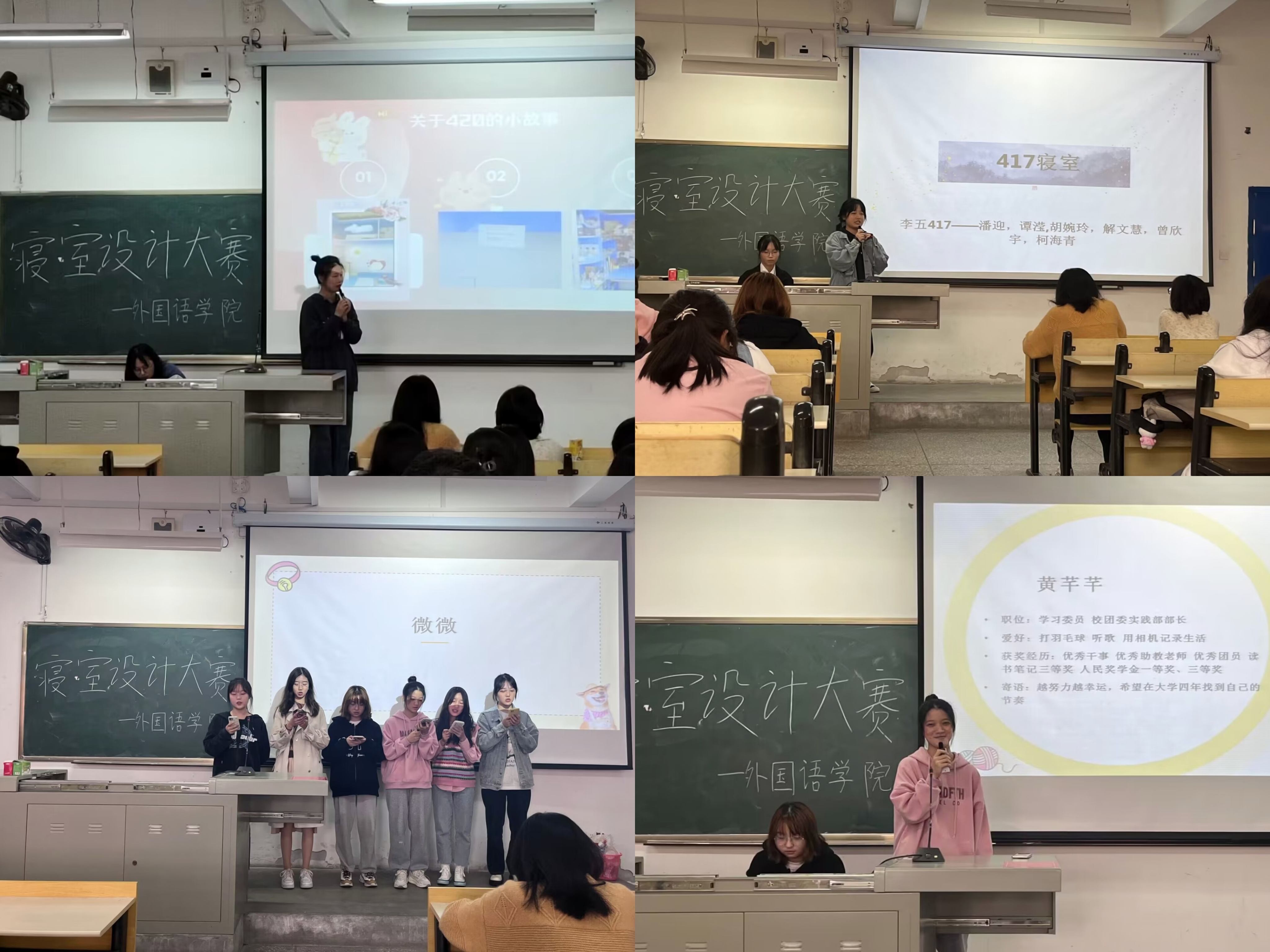 比赛分初赛、决赛两个阶段进行。初赛经过老师和员工评委现场参观评选,选出6个寝室进入现场展示决赛环节。决赛现场,入围寝室代表结合PPT依次上台进行展示,介绍各自寝室的设计理念、设计风格等。一个个温馨的小窝、一个个暖心的故事,一个个精彩的节目,见证了寝室成员间的友谊与梦想。