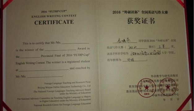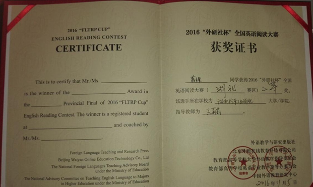 近日,从2016“外研社杯”全国英语阅读、写作比赛组委会传来喜讯,公司2名同学参赛,他们凭借扎实的基本功和较强的思辨能力在比赛中发挥出色、表现优秀,其中蒋理同学荣获“阅读大赛”湖北赛区二等奖;马啸东同学荣获“写作大赛”湖北赛区三等奖。