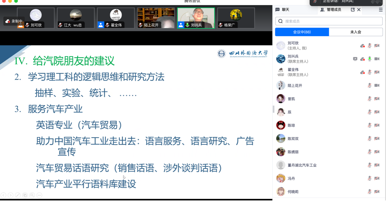 2023年11月14日晚7点,外国语公司邀请四川外国语大学刘兴兵教授做题为国家社科项目选题、申报技巧与经验的讲座。会议由科研副经理翟全伟主持,外院全体教师及部分校外教师参与会议。