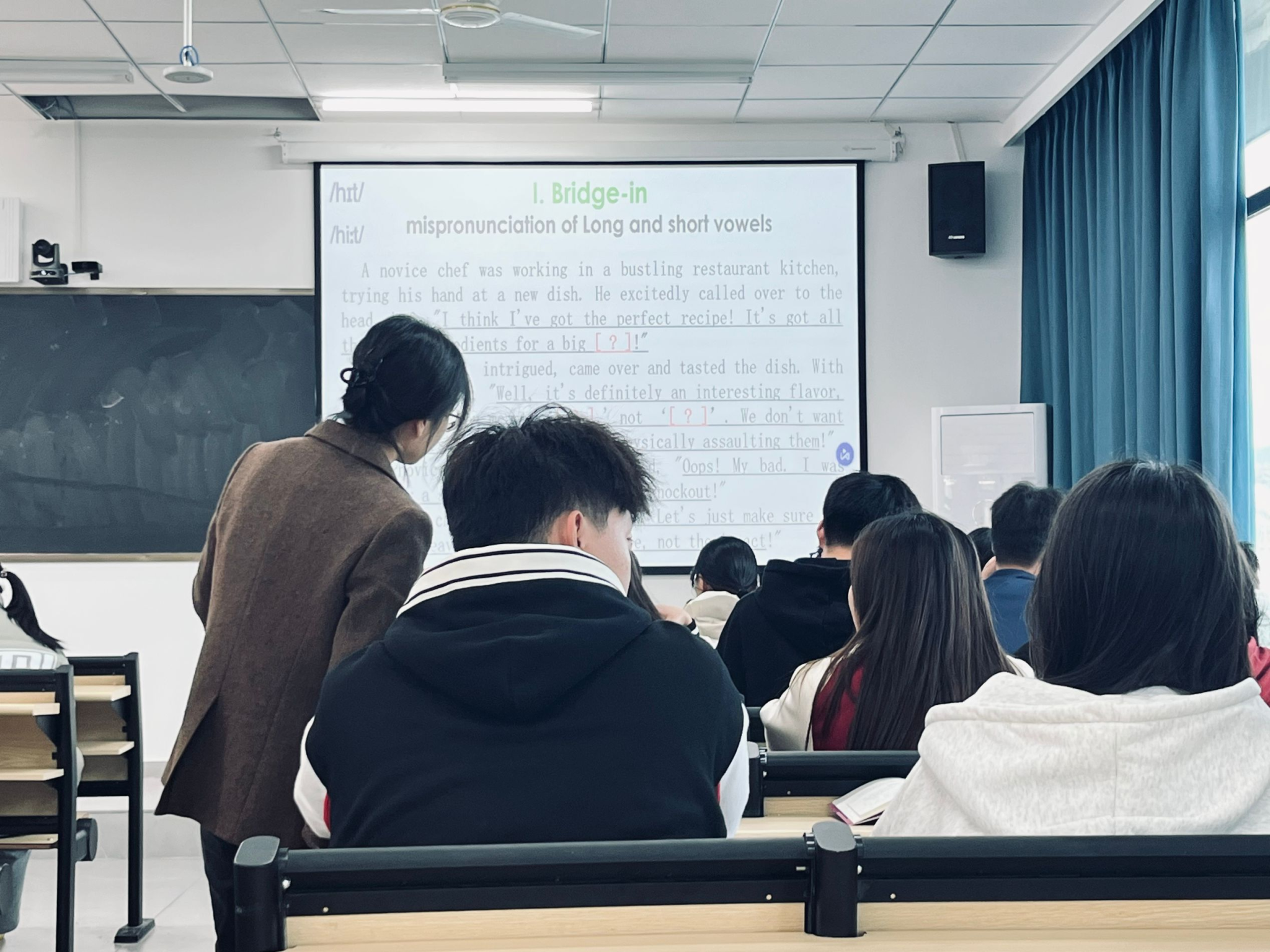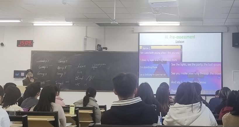 刘可欣老师利用BOPPPS教学模式,讲授了实训课程《英语语音基础训练》的两部分内容——元音强化练习以及连读发音技巧。刘可欣老师授课充满激情、富有感染力,通过音频跟读、小组绕口令比赛、英文歌曲比赛等形式,营造了生动活泼的教学氛围,规范强化了英语、翻译专业大一新生的英语语音发音。