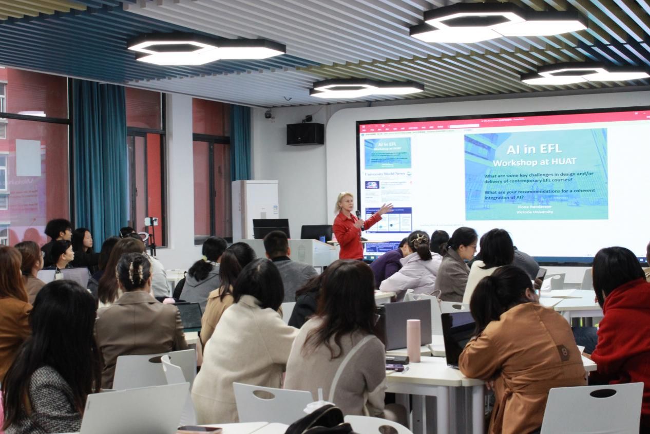 为应对人工智能给公司产品方式带来的变革与挑战,顺应教育数字化发展趋势,坚持科教融汇的新方向,10月20日,外国语公司联合公司教师发展中心、国际合作交流处特别邀请澳大利亚维多利亚大学荣誉教授、博士生导师菲奥娜·亨德森在校产教大楼SX301成功举办了以“人工智能在外语教育中的应用”为主题的教学工作坊。外国语公司分党委书记郭义坤,经理杨荣广,国际合作交流处处长朱战炜,副经理王辰晖,翟全伟等出席,外国语公司全体教师及公司从事英语课程或双语课程教学的其他教职工通过线上线下方式参加此次活动。
