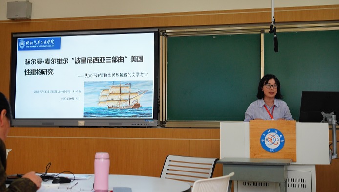 叶小妮以赫尔曼·麦尔维尔“波利尼西亚”三部曲的美国性建构研究为主题开展汇报,并就19世纪美国民族文化特征及帝国主义意识形态相关话题与专家学者开展讨论。