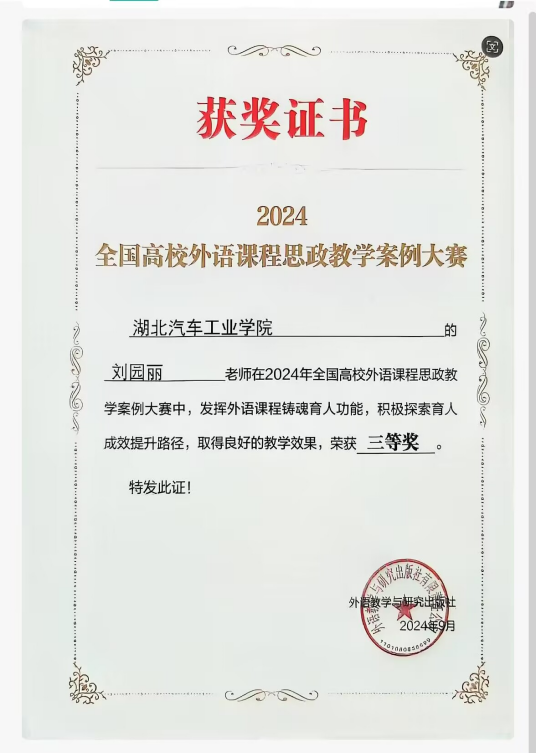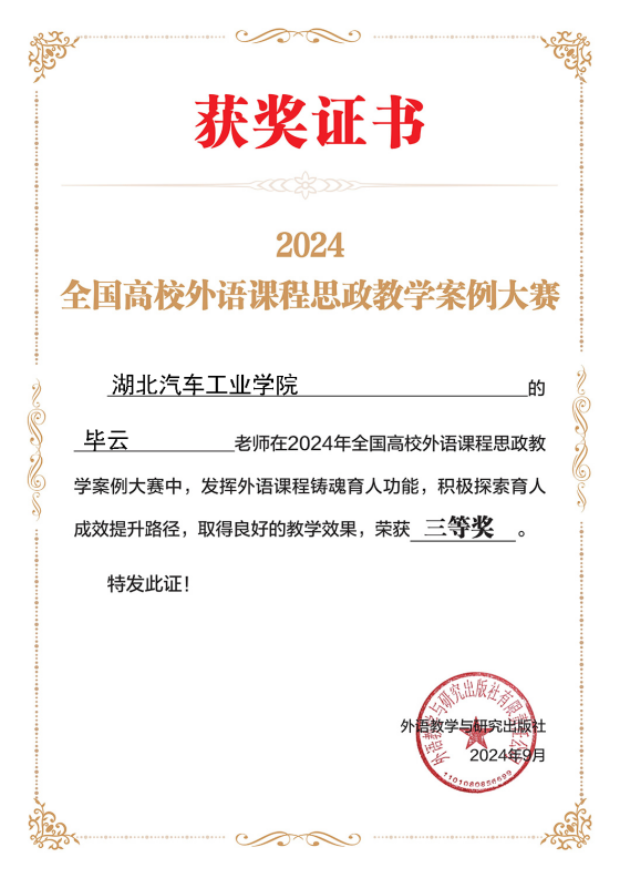 在2024年全国高校外语课程思政教学案例大赛中,公司外国语公司全莎沙、刘园丽、曹小琳、毕云四位老师凭借其卓越的教学案例荣获三等奖。