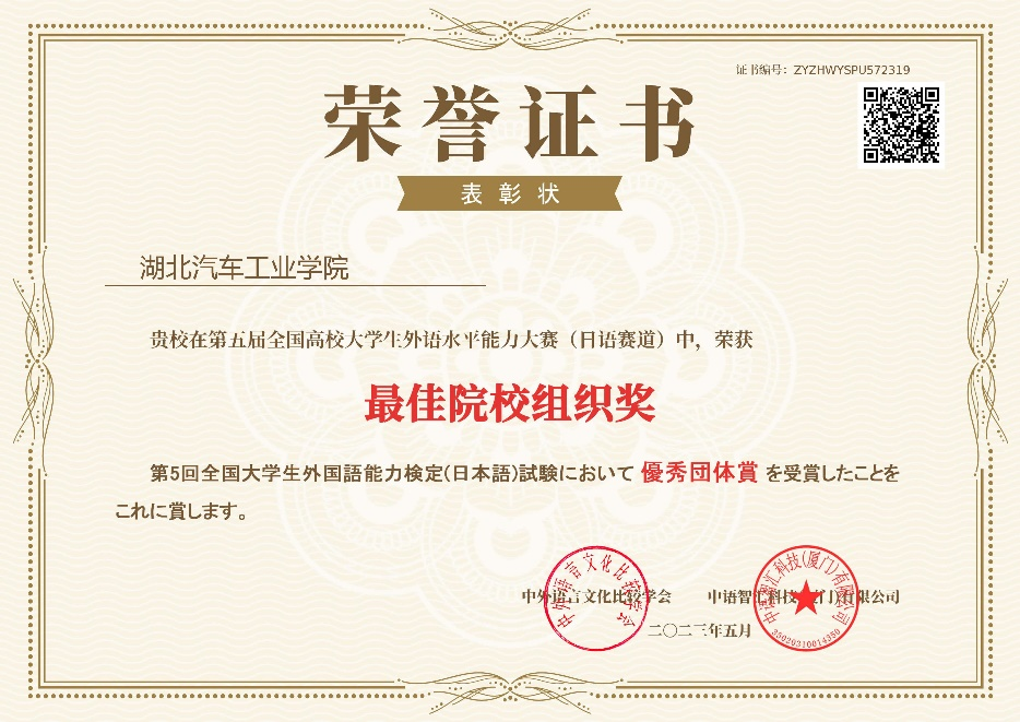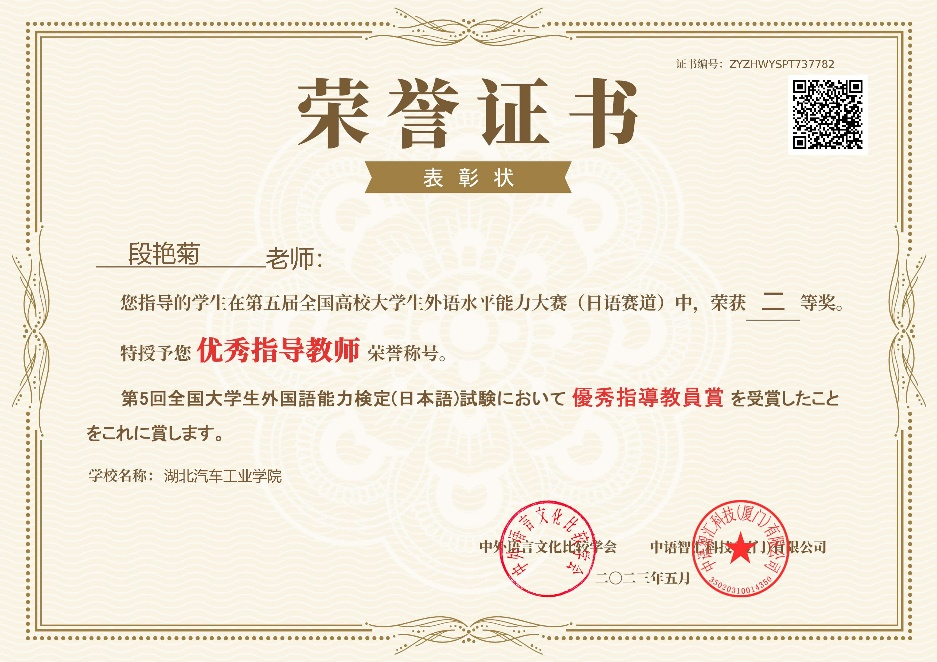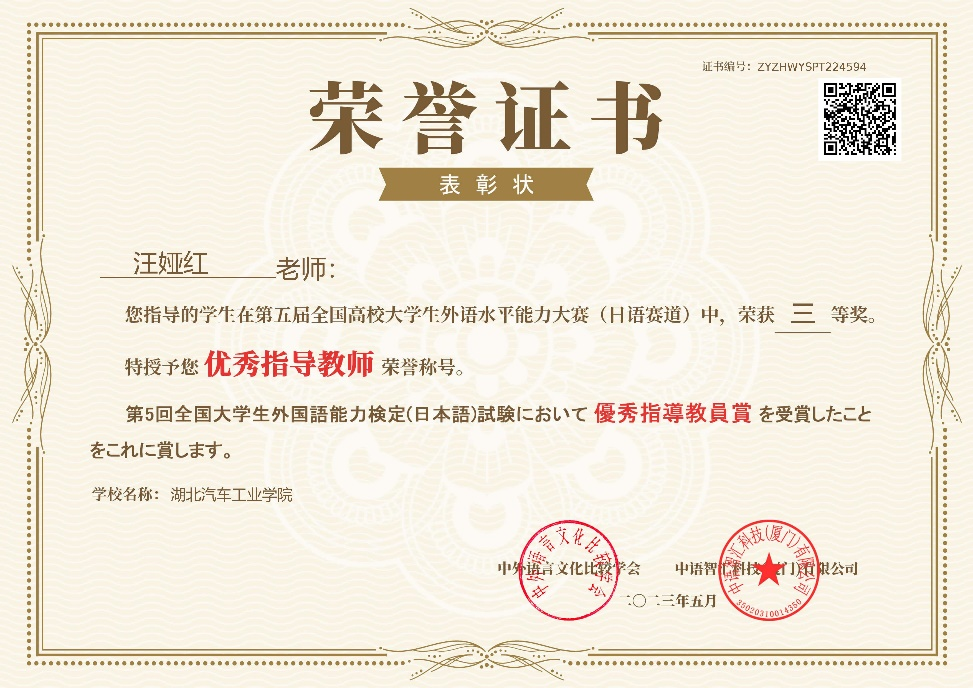 大赛自3月启动报名以来,吸引了全国各大高校师生关注,日语赛道共有来自全国180余所高校的9千余名员工报名,经初赛、决赛两个环节的比赛,最终日语赛道共有775名员工斩获大赛奖项。公司359名员工报名参加日语赛道比赛,得了二等奖1项、三等奖23项的佳绩。此外,bevictor1946韦德官网因组织有力,参赛员工成绩优异,经组委会评选后被授予“最佳院校组织奖”称号,段艳菊和汪娅红两位老师获得“优秀指导教师”荣誉称号