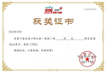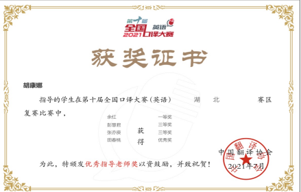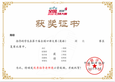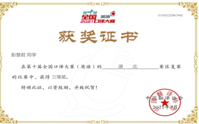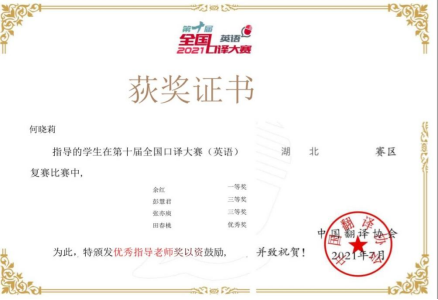2021年6月12日至13日,第十届全国口译大赛(英语)湖北赛区复赛如期举行。第十届全国口译大赛(英语)由中国翻译协会主办,中国外文局指导,采取线上比赛的方式。