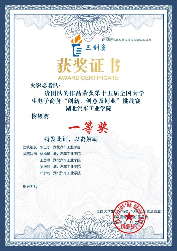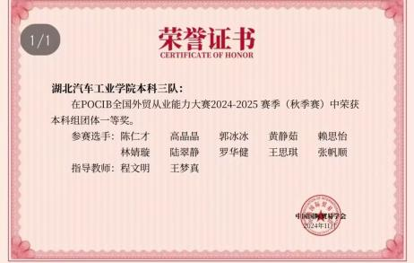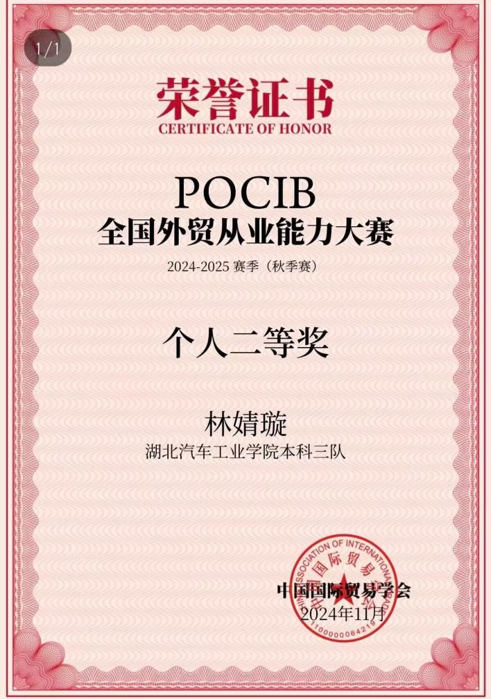 赛场是她的第二课堂:在POCB全国外贸从业能力大赛中,她泡在教室练函电、审单证,模拟真实外贸场景反复推演,最终从全国千余名选手中突围,拿下个人二等奖;在ICAN跨境数字营销挑战赛里,她负责海外社媒方案设计,用“农产品+国风元素”的创意,助力团队摘得省级三等奖;电商三创赛中,她融合武当文化特色,用一手数据支撑“跨境助力武当山发展”项目,拿下校级一等奖。“竞赛不是终点,是逼自己跳出舒适区的跳板。”她的竞赛文件夹里,存着十几版修改痕迹的方案,每一笔都是成长的注脚。