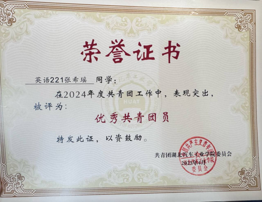 在工作方面,张希瑶表现出极强的责任心和出色的组织协调能力。作为党支部组织委员,她始终以服务同学、协助老师为己任。对待工作一丝不苟、认真负责,积极主动地策划、组织并落实如新生入党教育、发展对象推优、公司党建品牌等各项活动。作为团支书,她注重团队协作,善于调动同学们的积极性,能够有效沟通,是老师得力的助手,也是同学们信赖的伙伴。曾带领班级获得院级活力团支部一等奖,并被评为年度五四红旗团支部,举办了班级特色活动“庆新年”“品传统文化,过多彩端午”等。班级的凝聚力和活力显著增强,相关工作得到了师生的一致好评。