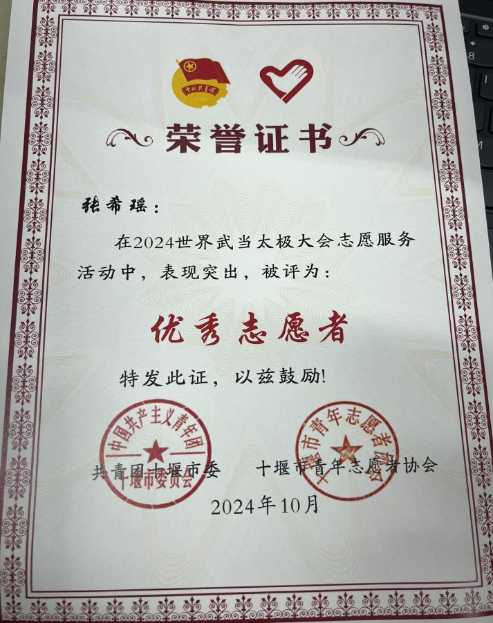 张希瑶积极投身于各类社会实践和志愿服务活动中。她利用课余时间参加社区服务、环保宣传等志愿服务。她积极参加校园公益活动,用实际行动传递青春正能量,于2024年参加世界武当太极大会并被评为优秀志愿者。目前志愿时长有747小时,曾被评为文化月积极分子。通过这些实践活动,她不仅提升了沟通协调、解决实际问题的能力,更培养了服务社会、奉献人民的奉献精神。